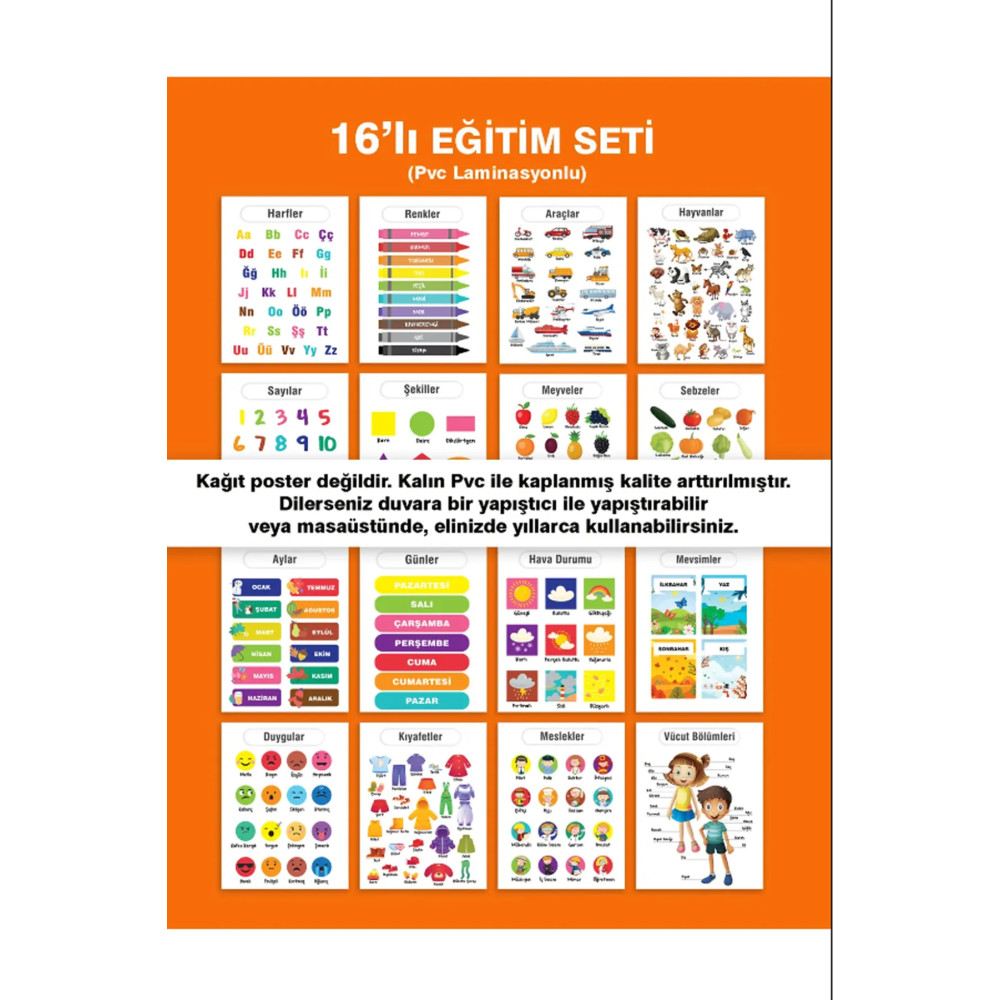 Türkçe 16'lı Eğitim Seti Okul Öncesi - Ilköğretim Çocuk Poster Pvc