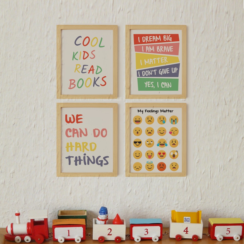 Çocuk & Bebek Odası Emoji Doğal Ahşap Çerçeveli 4'lü Tablo Seti