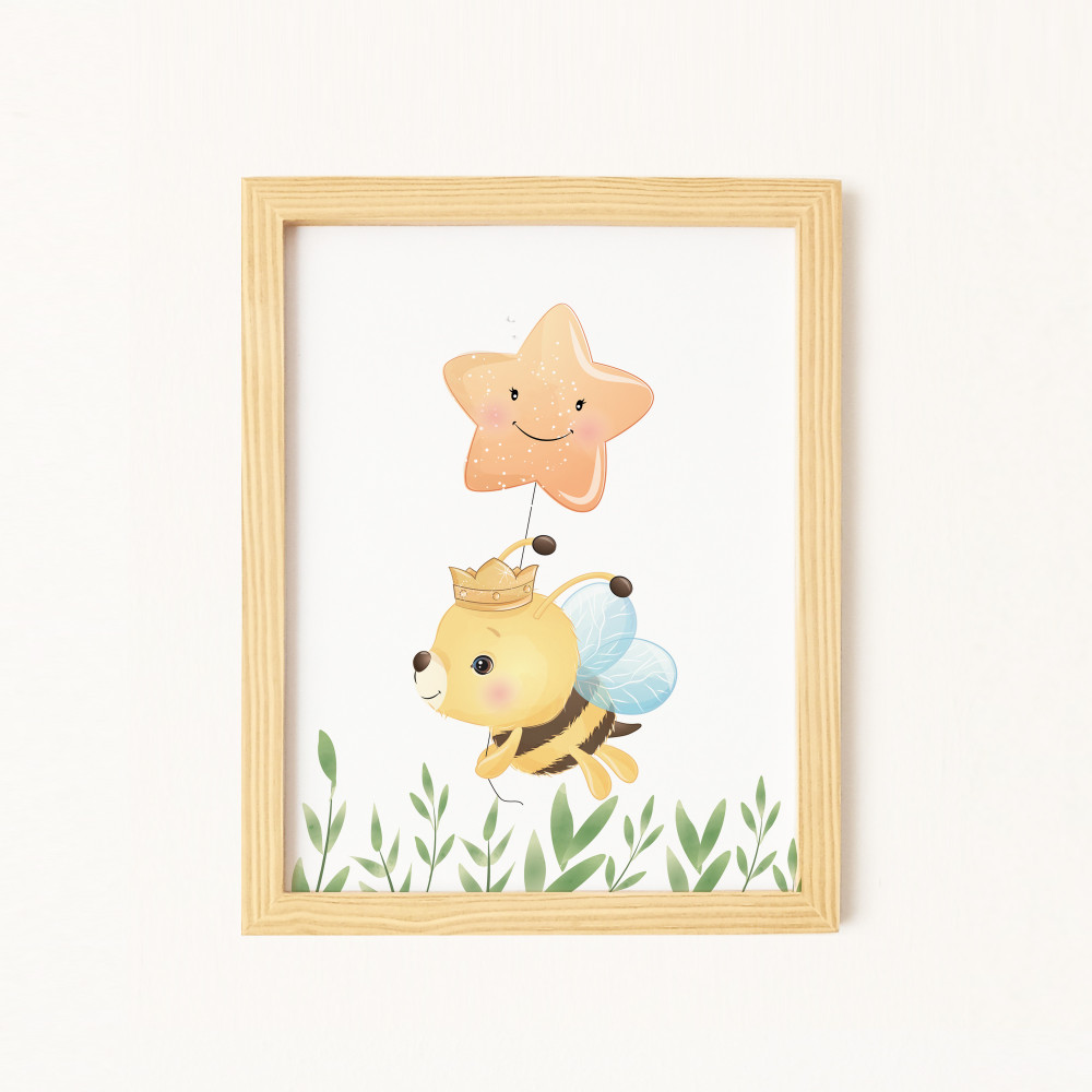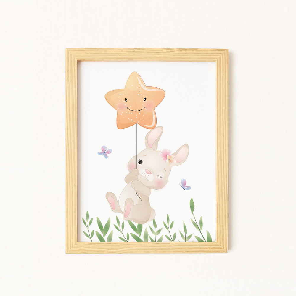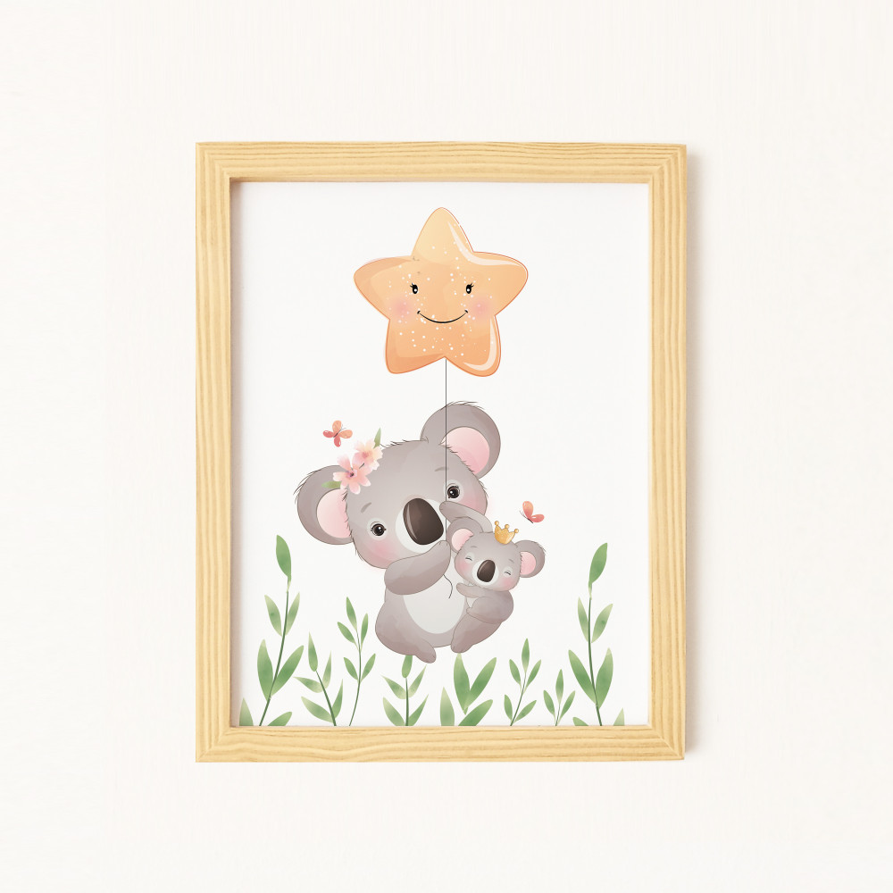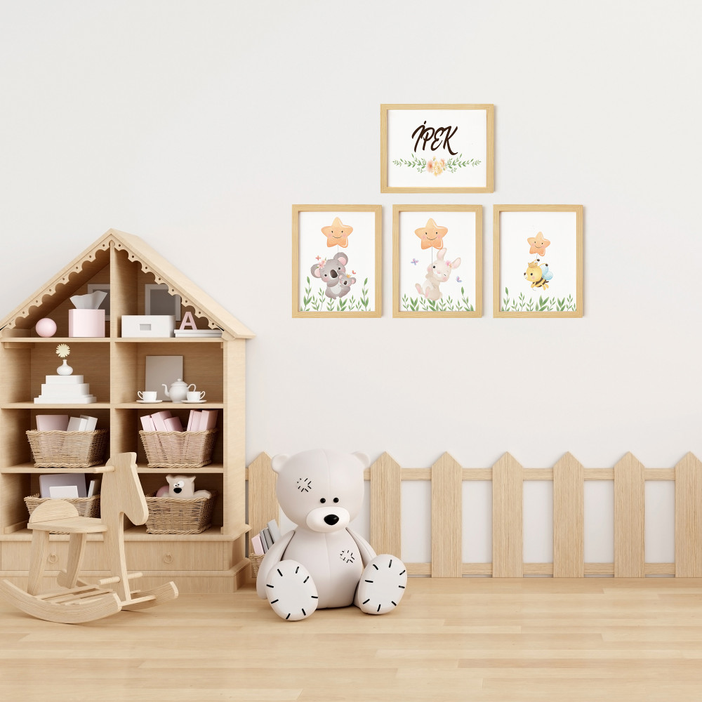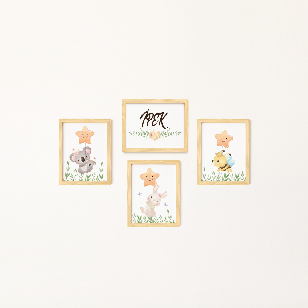 Çocuk & Bebek Odası Sevimli Hayvanlar İsimli Doğal Ahşap Çerçeveli 4'lü Tablo Seti