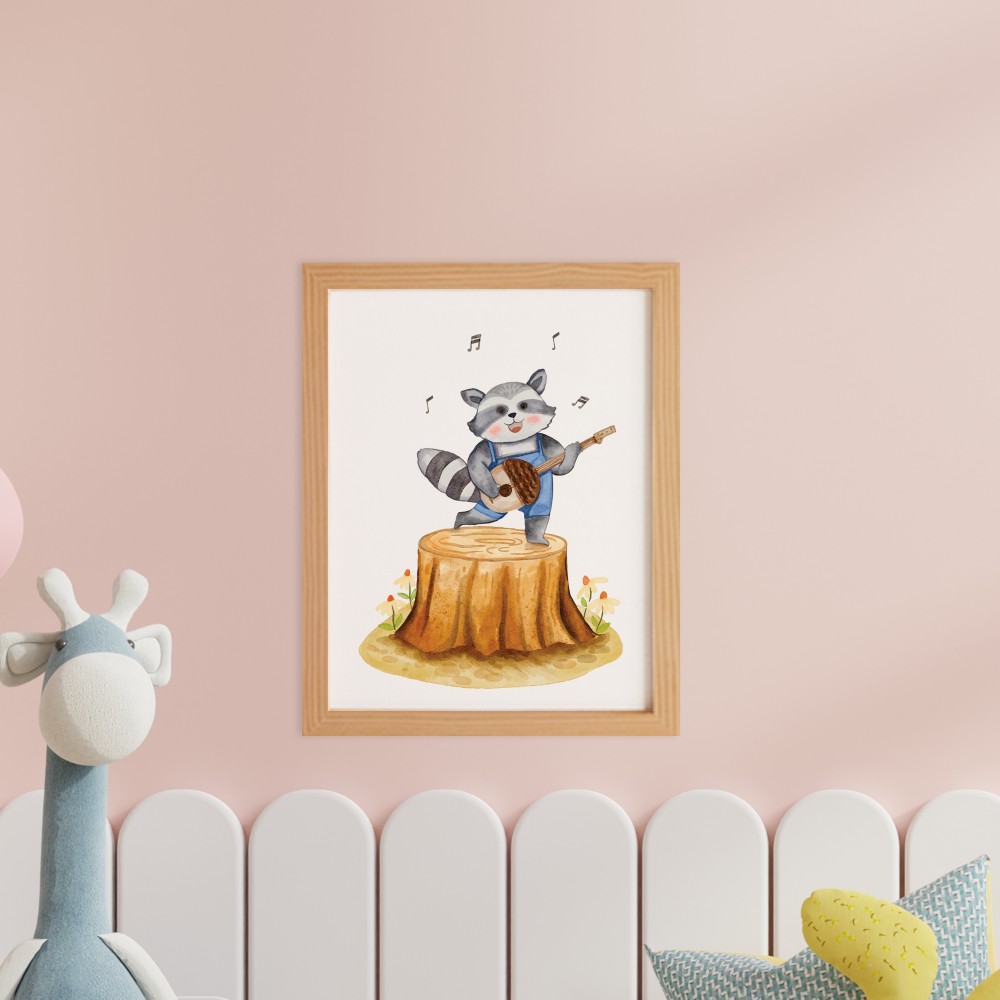 Şarkı Rakun-Singing Raccoon Doğal Ahşap Çerçeveli Tekli Tablo Seti
