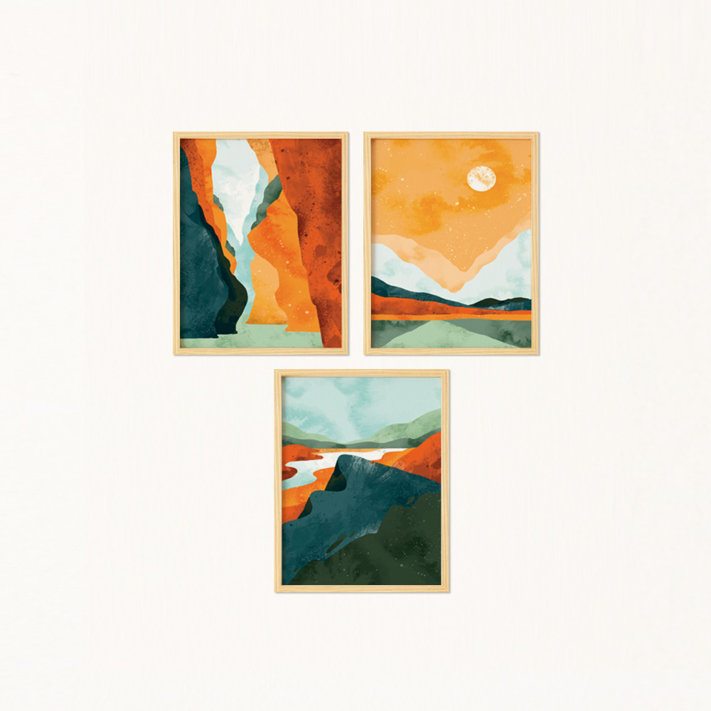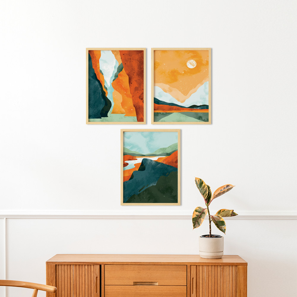 Mountain Landscape-Dağ Manzarası Doğal Ahşap Çerçeveli 3'lü Tablo Seti