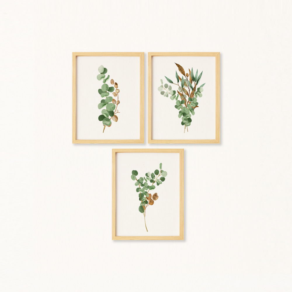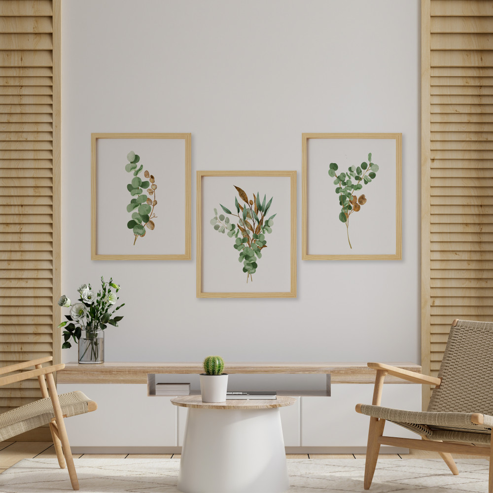 Ocaliptus Leaf-Okaliptus Yaprak Ahşap & Lamine Çerçeveli Çoklu 3'lü Tablo Seti