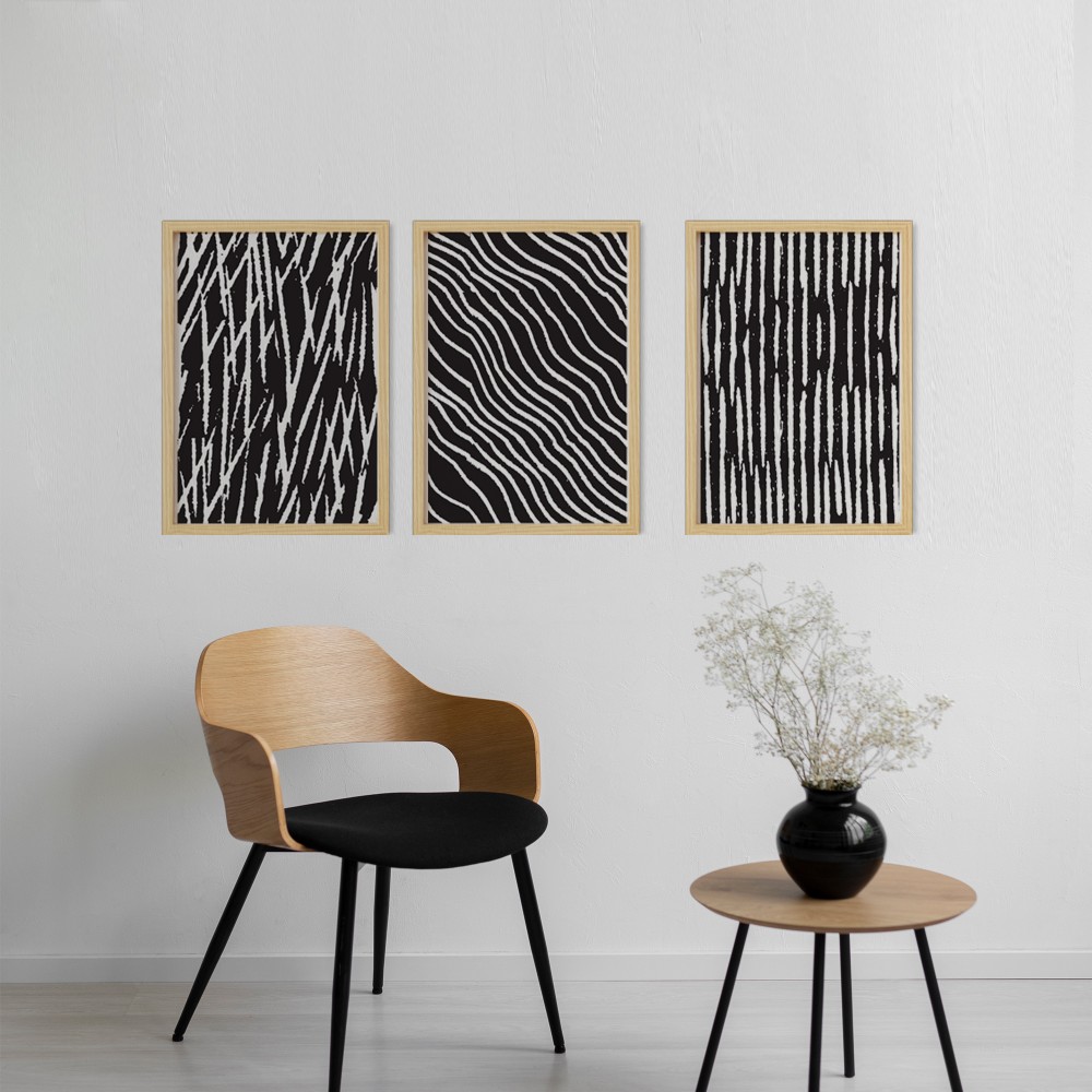 Bohem & İskandinav Line Scribble Doğal Ahşap Çerçeveli 3'lü Tablo Seti