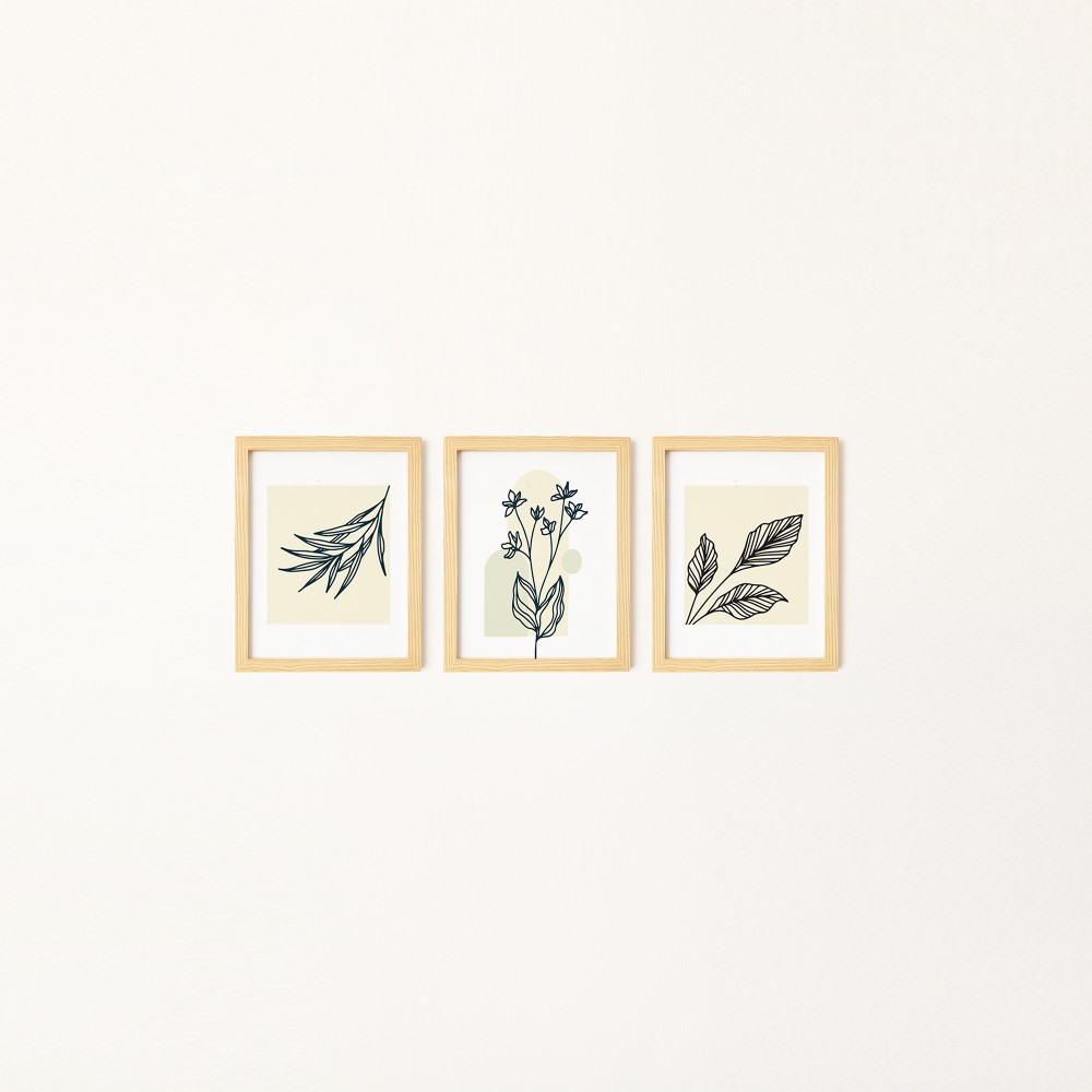 Uzun Yaprak Doğal Ahşap Çerçeveli 3'lü Tablo Seti