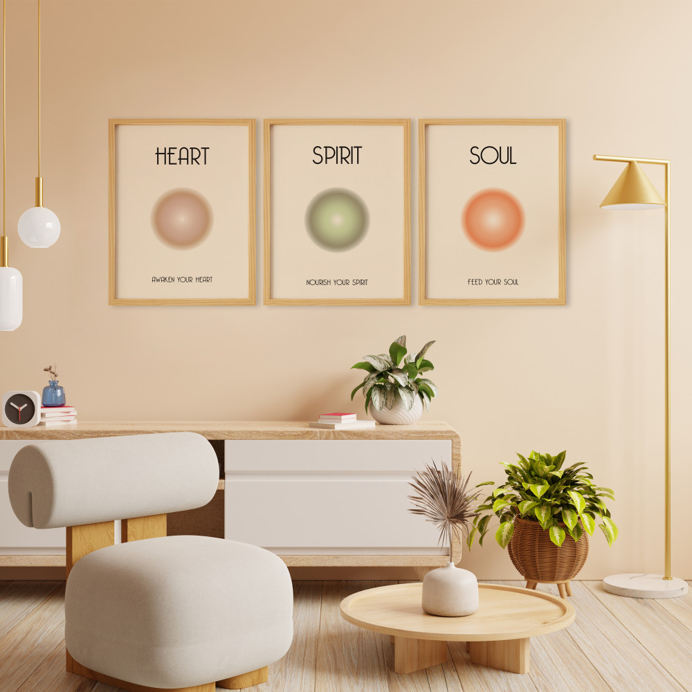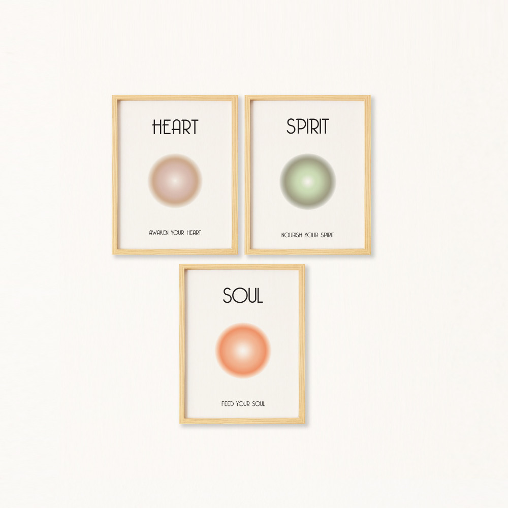 Aura-Heart-Spirit-Soul Doğal Ahşap Çerçeveli 3'lü Tablo Seti
