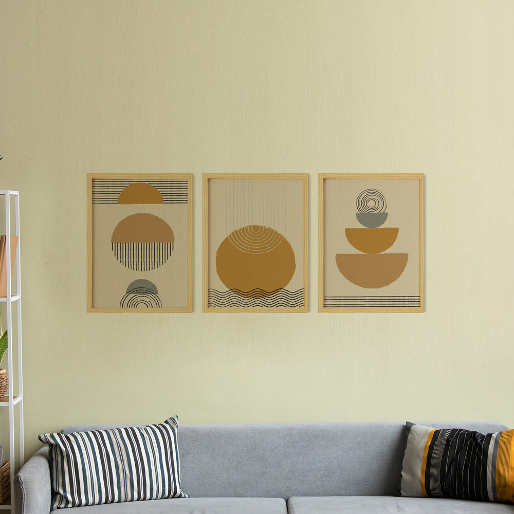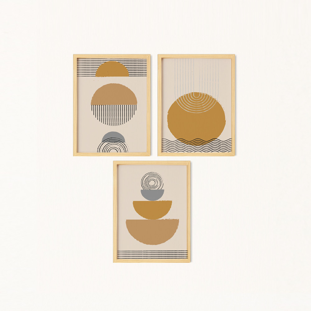 Soyut Wavy Circles Doğal Ahşap Çerçeveli 3'lü Tablo Seti