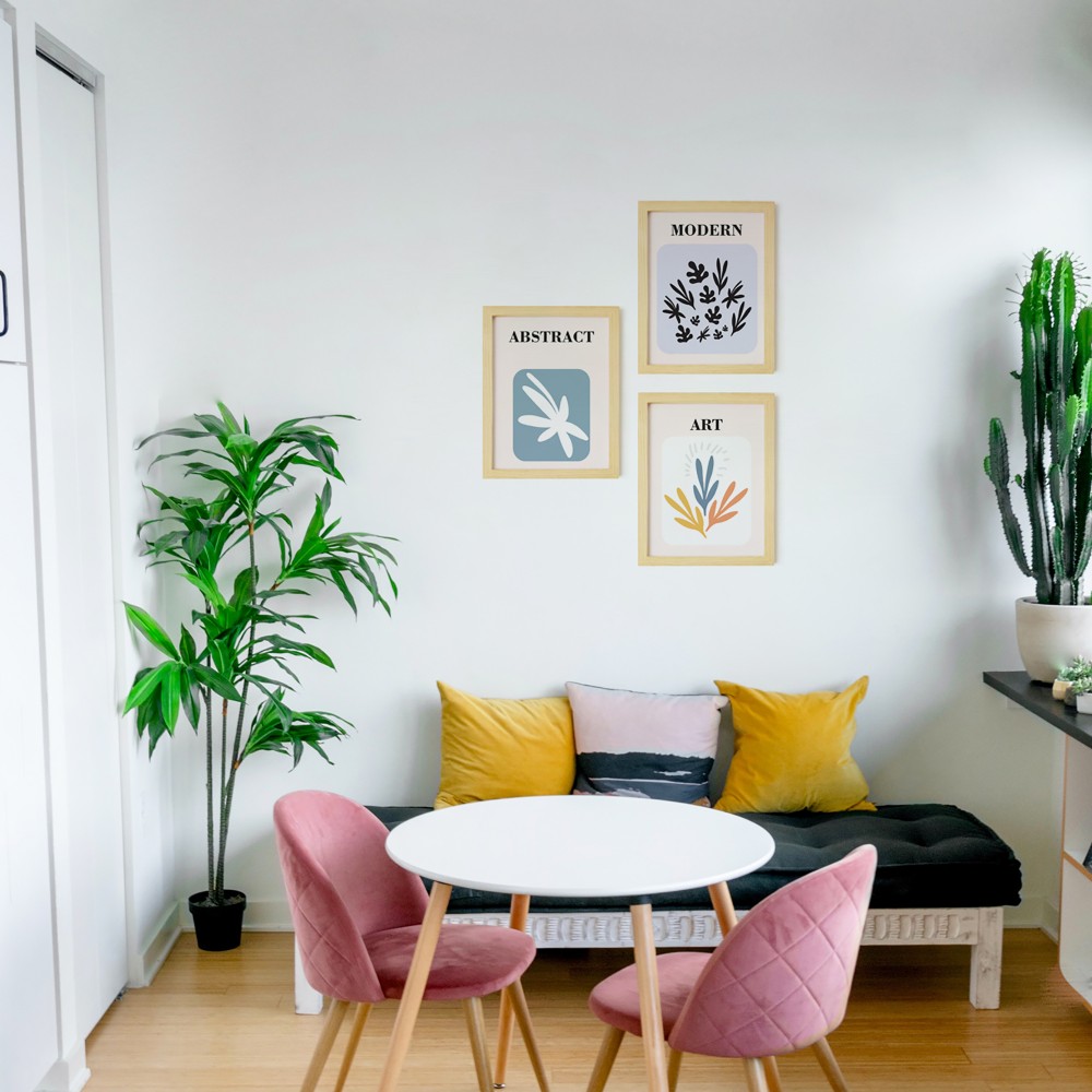 Soyut Modern Sanat Doğal Ahşap Çerçeveli 3'lü Tablo Seti