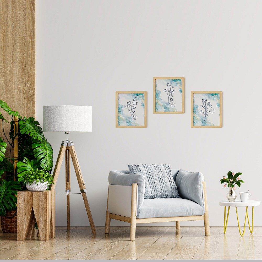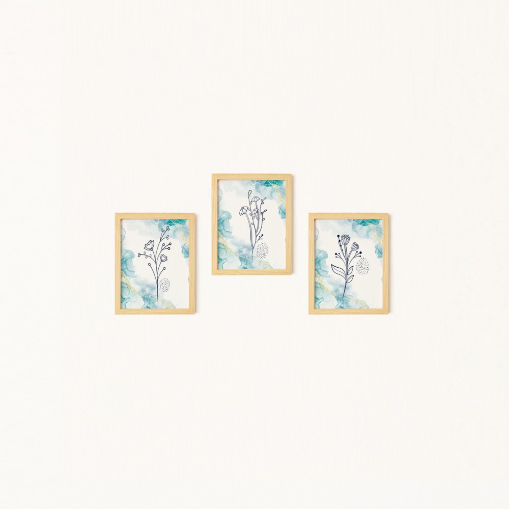 Mavi Çiçek Doğal Ahşap Çerçeveli 3'lü Tablo Seti