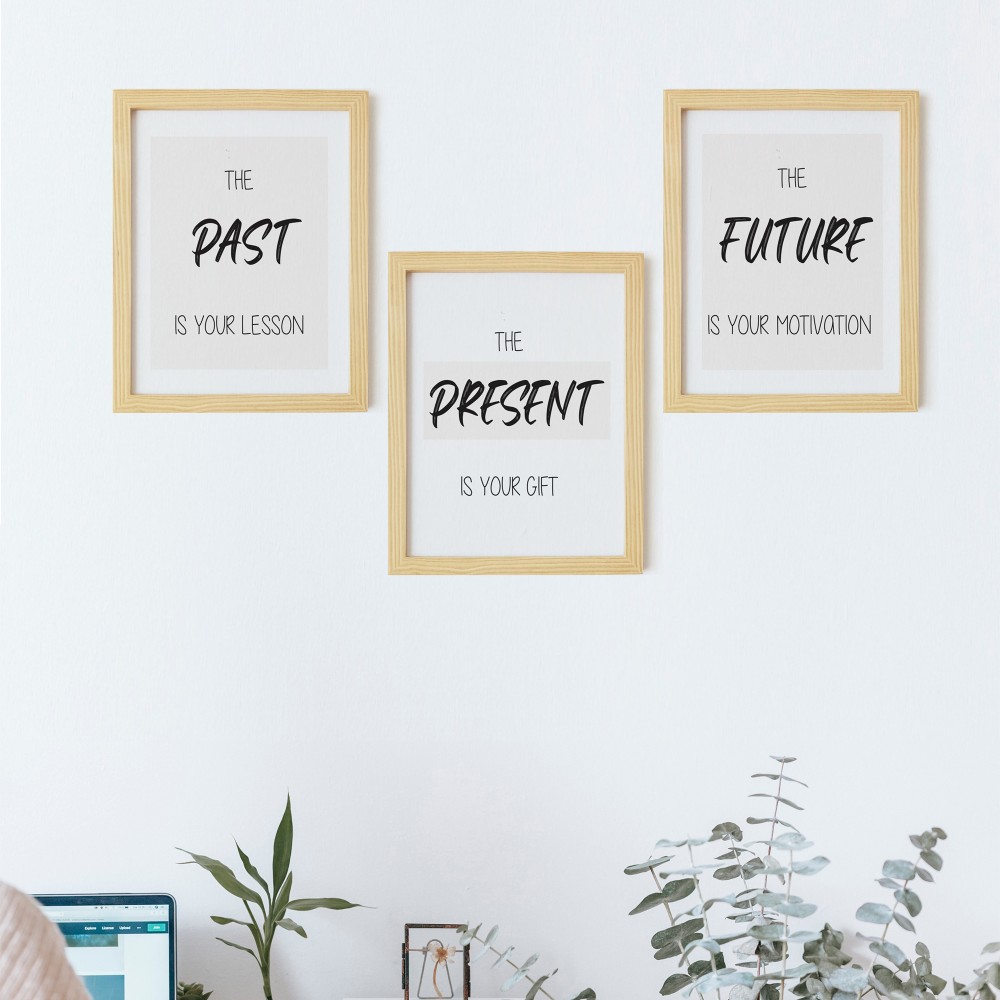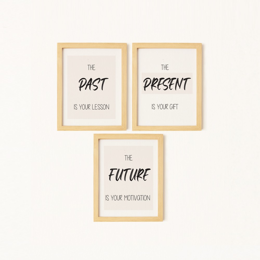 Geçmiş - Şimdi - Gelecek Doğal Ahşap Çerçeveli 3'lü Tablo Seti