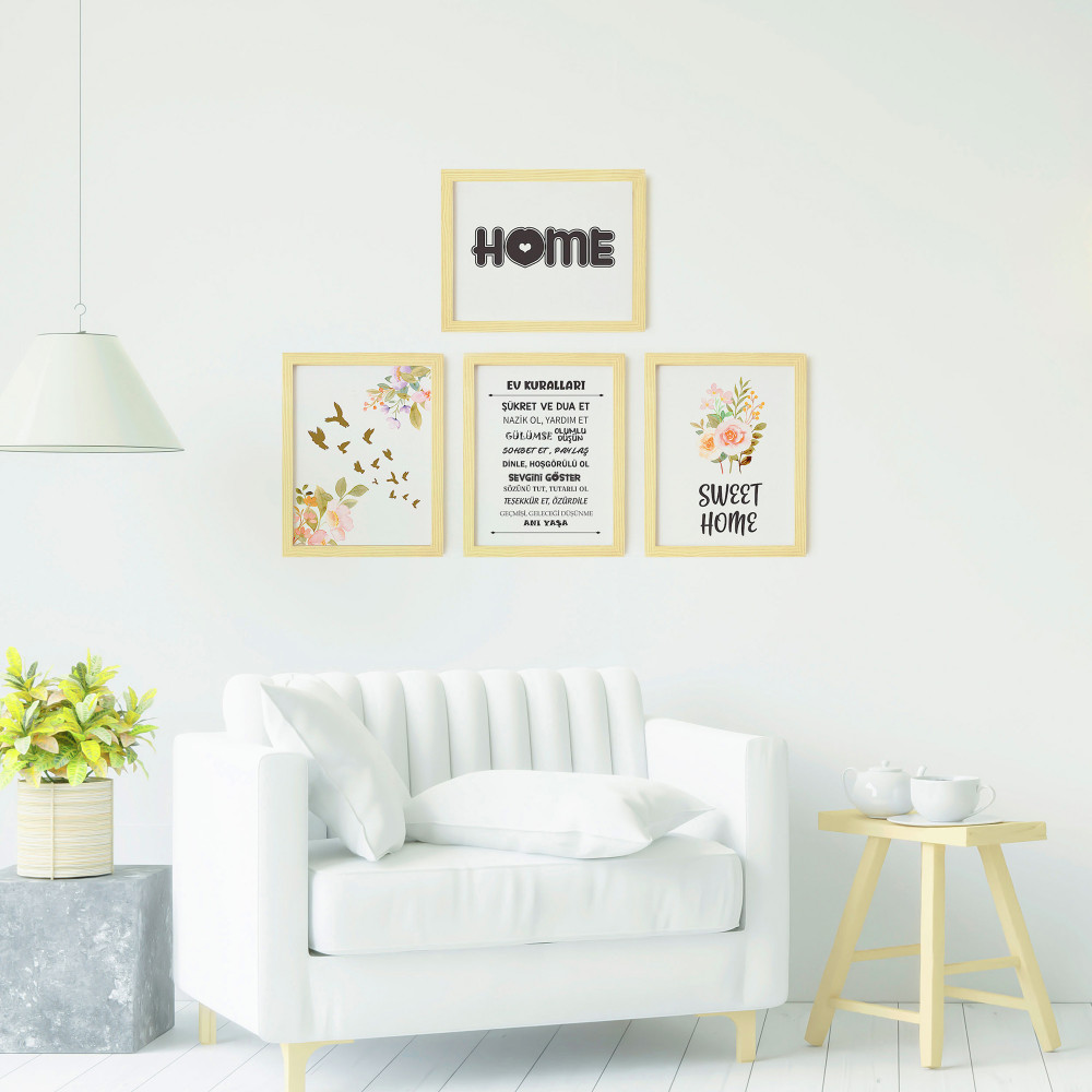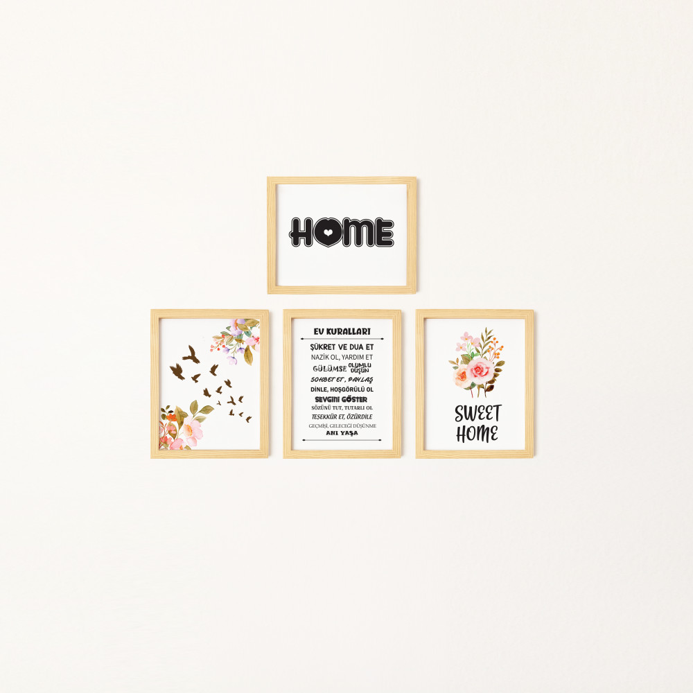 Tatlı Evim Doğal Ahşap Çerçeveli 4'lü Tablo Seti